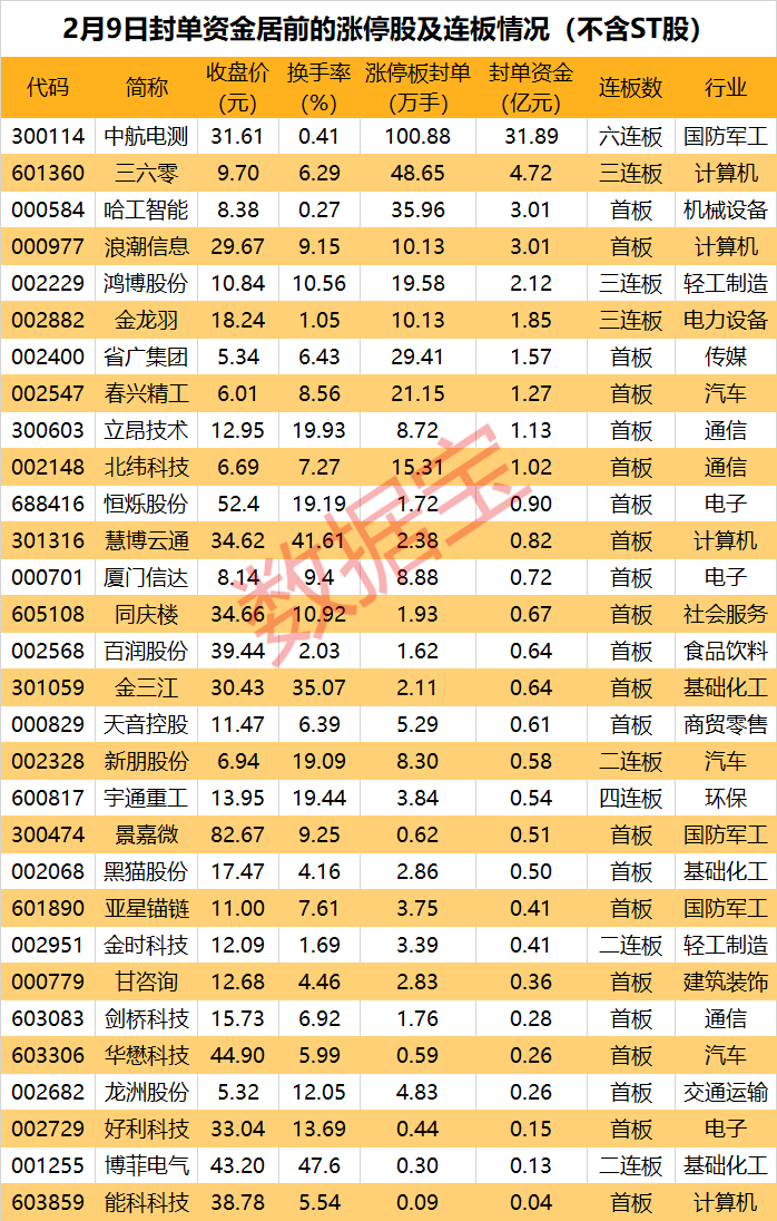 以封单金额计算,中航电测、三六零(601360)、哈工智能涨停板封单金额居前,分别为31.89亿元、4.72亿元、3.01亿元。