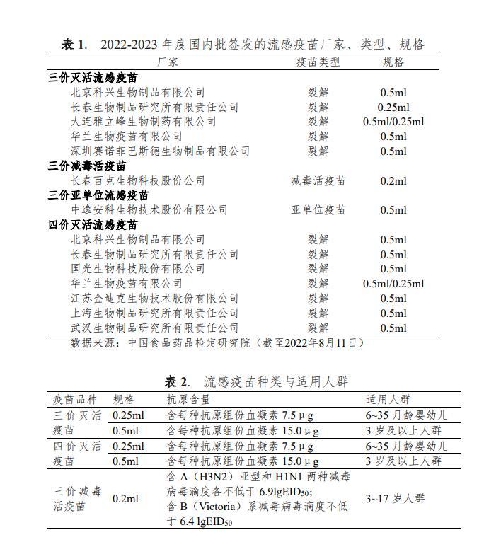 据中国国家流感中心,我国现已批准上市的流感疫苗有三价灭活流感疫苗(IIV3)、四价灭活流感疫苗(IIV4)和三价减毒活疫苗(LAIV3)。截至 2022年 8 月 11 日,已有 11 家厂家供应流感疫苗。