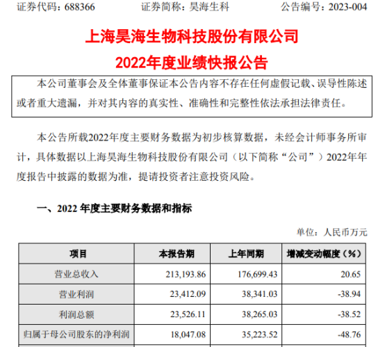 挖贝网2月28日,昊海生科(688366)发布2022年度业绩快报,公告显示,2022年度营业总收入为213,193.86万元,比上年同期增长20.65%;归属于母公司股东的净利润为18,047.08万元,比上年同期下滑48.76%。