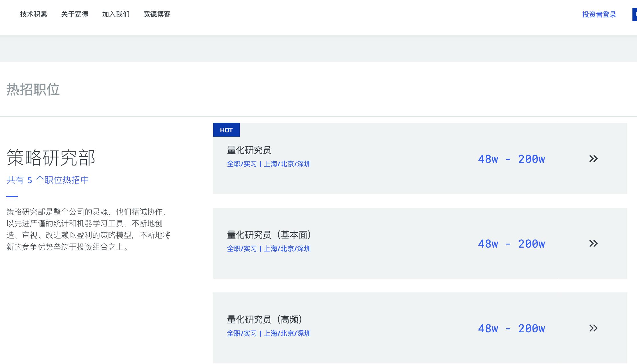 寬德投資官網顯示,其策略研究部的“量化研究員”崗位年薪48萬元起,最高可達200萬元。